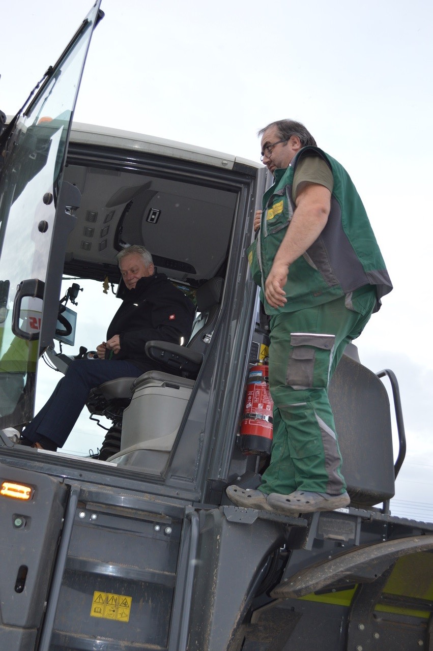 Der Bundesminister ließ sich die angebotene Gelegenheit nicht entgehen und fuhr mit dem Claas Xerion und einem 9 m breiten Grubber einige gekonnte Runden auf dem Vorgewende des Feldes.