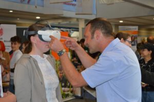 Schülerin Sarah Deike bekommt von Christian Apprecht, Bauernverband Börde, die Virtual-Reality-Brille aufgesetzt, mit der sie sich in einem landwirtschaftlichen Betrieb umsehen kann