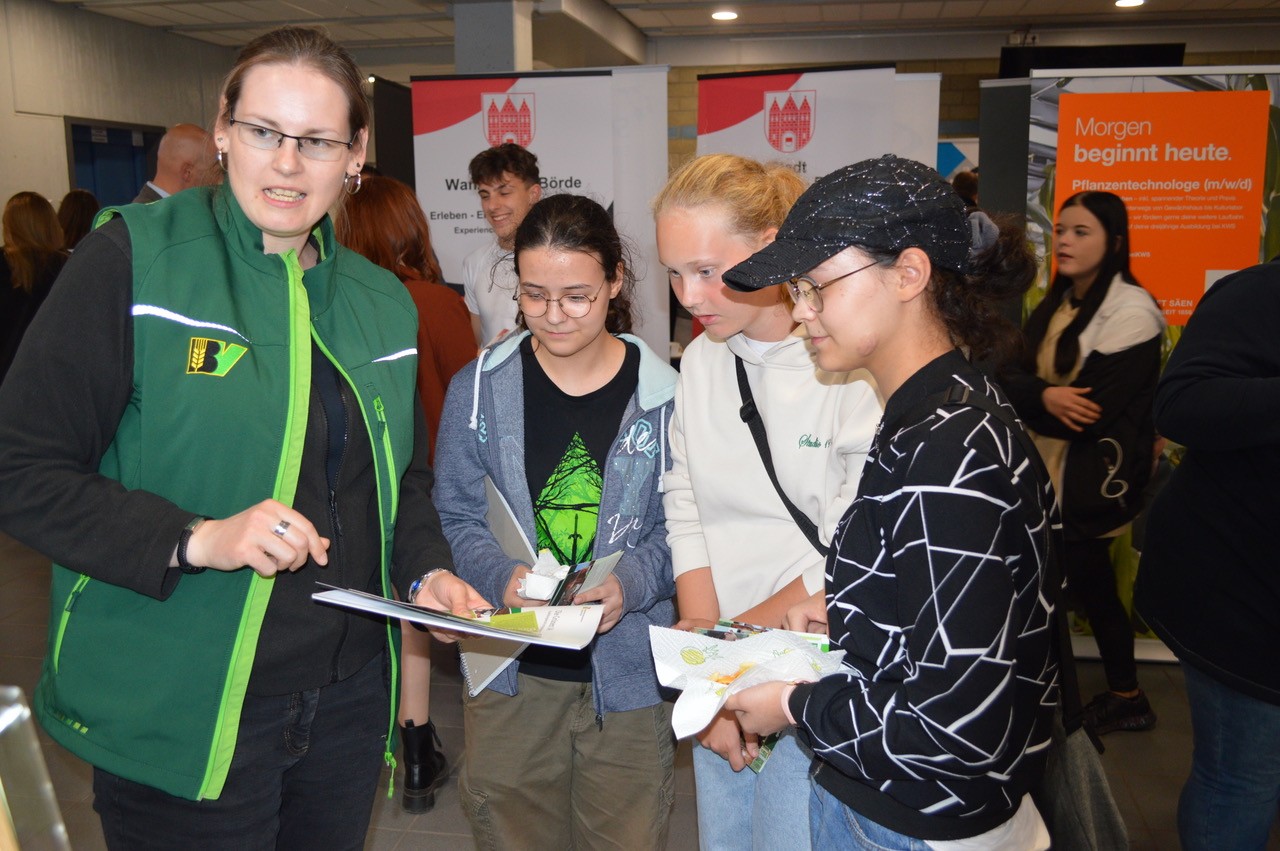 Stefanie Pötzsch ging mit Lars Wärmer, Toralf Schröder, und Oscherslebens Bürgermeister Benjamin Kanngießer durch die bunten Stände der Unternehmen, die von den Jugendlichen, allein, in Grüppchen oder mit Eltern belagert wurden. Ein Stimmengewirr in den Fluren der Berufsschule. Dabei ging von grober Orientierung über die Möglichkeiten, das Materialsammeln bis zu konkreten Abmachungen und dem Austausch von Telefonnummern oder Mailadressen. So gab es am Stand des Bauernverbandes kurze Nachfragen nach Aufstiegsmöglichkeiten aber auch lange intensive Gespräche über Betriebe, Ausbildungsinhalte oder Berufsschulen.
