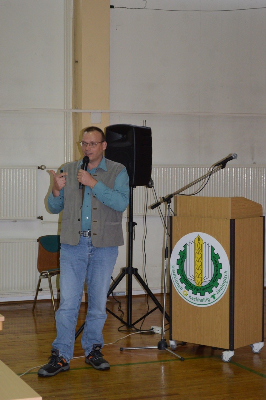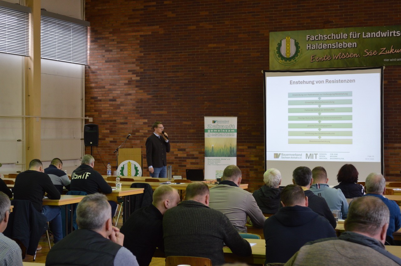 Unter dem Motto der Fachschule „Ernte Wissen. Säe Zukunft“, das Logo ist im Saal in der Bornschen Straße angebracht, folgten die Bauern den Vorträgen der Fachleute: