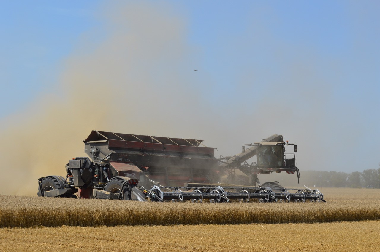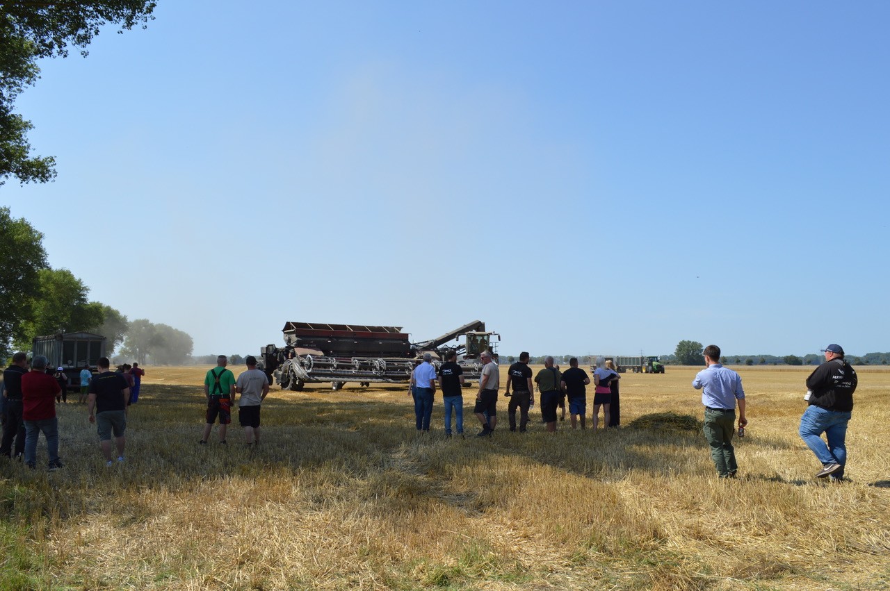 Auf einem der letzten Getreidefelder bei Großalsleben war gestern eine gigantische Maschine im Einsatz, die viele Schaulustige anzog, darunter etliche Landwirte, die den „Nexat“ bisher nur von der großen Agrartechnikausstellung „Agritechnica“ kannten. Landwirt Dr. Klaus Nehring (NIB agro, Oschersleben & Vorstand Bauernverband Börde e.V.) nutzte sein Netzwerk: Bei Freunden in Winnigen war die Technik im Einsatz und so lud Nehring die Nexat-Leute und ihren Mähdrescher auf seinen allerletzten Weizenschlag, die sogenannte „Espe“ ein. Hier konnten außer seiner eigenen Crew etliche Interessierte den „Nexat“ im Einsatz bestaunen; Agrarblogger waren vor Ort, eine Drohne flog übers Feld und Handyfotos wurden wohl zu Hunderten geschossen.