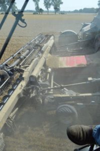 Es ist eher eine Aufsicht über die 6 Kameras am Display, die Feinjustierung und das Heranrufen der Abfahrer. „Die“, so Battige, „wollen wir eigentlich auf dem Feld gar nicht mehr haben. Die sollen am Vorgewende warten, bis ich dort bin.“ Es geht um die möglichst zu vermeidende Bodenverdichtung und den Kraftstoffverbrauch. „Nexat“-Mitarbeiter Robert Klaus erklärt das Prinzip der optimalen Gewichtsverteilung, der präzisen Maschinenführung, des Einzelradantrieb sowie den Wegfall zusätzlicher Achsen zur Vermeidung des „Bulldozing-Effektes“. (Beim Fahren auf dem Feld wird der Boden je nach Reifendruck verformt und das Rad sinkt ein. Es schiebt so eine Bodenwelle vor sich her, die ein ständiges Bergauffahren nötig macht.) Der Bunker/Korntank des „Nexat“ ist 32 Kubikmeter groß und die Überladegeschwindigkeit ist ungefähr dreimal so hoch wie bei normalen Mähdreschern; sie legt bei 650 Litern pro Sekunde. Peter Battige, der Mähdrescherfahrer ruft den Abfahrer per Funk und als er neben ihm fährt, ist der Hänger in einer halben Minute beladen. „Bist voll, kannst los“, lautet die kurze Funkmeldung.
