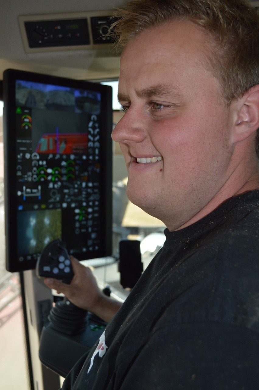 Die Kabine dreht und senkt sich dabei. Ich kann einsteigen. Der Fahrer Peter Battige schließt die Tür der rundumverglasten Kabine hinter mir und trotz des Lärms draußen, ist es plötzlich sehr ruhig hier drinnen. Die Kabine fährt hoch, dreht sich ein und schon geht es los. Ich kann auf das von ganz hoch oben schräg auf kolossale Mähwerk schauen. Ein großes Display rechts neben dem Fahrer ist voller Zahlen, Diagramme, Wörter und Kamerabilder.