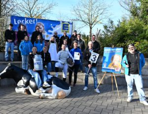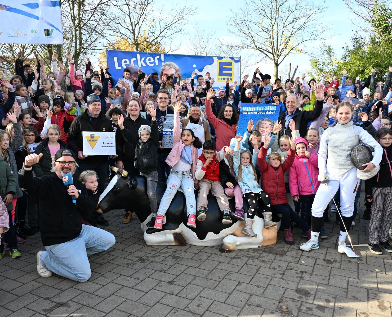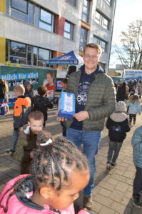 Bis kurz vor der Hofpause wussten die meisten Schüler nichts von der Überraschung und so war die Freude groß, als die Schulklingel zur Hofpause erklang. Musik aus einer großen Anlage läutete das fröhliche Treiben ein. Milchausschank am Stand der Landfrauen Susanne Wiersdorf und Christine Haag sowie gesundes Essen in handlichen Stücken spendiert von Edeka ersetzten an diesem Tag die individuellen Frühstücksdoseninhalte und Wasserflaschen. Auch die großen Kinder der nahen KITA „Max und Moritz“ nahmen mit zwei Erziehern an dem Milchtag teil. KITA und Schule haben einen Kooperationsvertrag abgeschlossen.