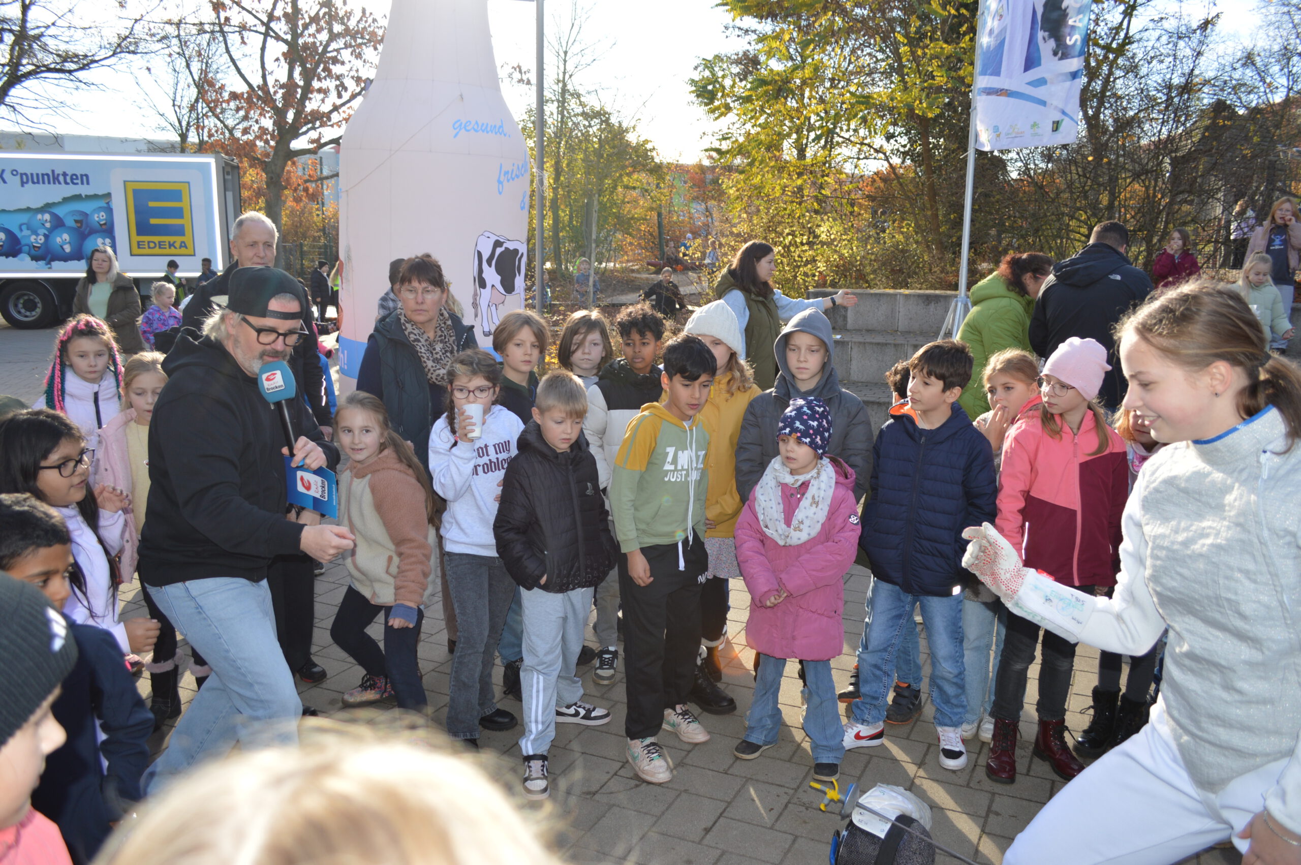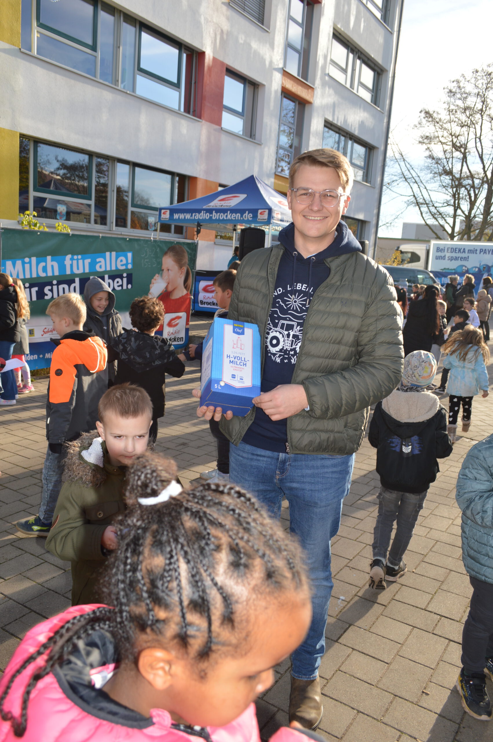 Radio- Brocken Moderator Mathias Jettschat warb mit seinem Song über die „Kuh-le Pause“ gestern vor den 275 Schülern der Grundschule „Erich Kästner“ für eine gesunde Ernährung, Sport und vor allem für das Milchtrinken. Mit fröhlichem Gesang, Spielen, Tanz und Erklärungen zum Thema führte der lebhafte Eventmanager durch die große Hofpause der Kinder. Zum aktionsreichen Projekt „Milch für alle“ haben sich Sachsen-Anhalts Landwirtschaftsministerium, Radio Brocken, Edeka, Agrarmarketinggesellschaft, Bauernverband, Landfrauen und Landessportverband zusammengeschlossen und gehen an mehreren Tagen im Jahr an verschiedene Schulen im Land, die sich dafür bewerben können. Schulleiterin Karoline Vehmeier freute sich sehr, dass ihre Schule in den Genuss dieser Aktion kam.
