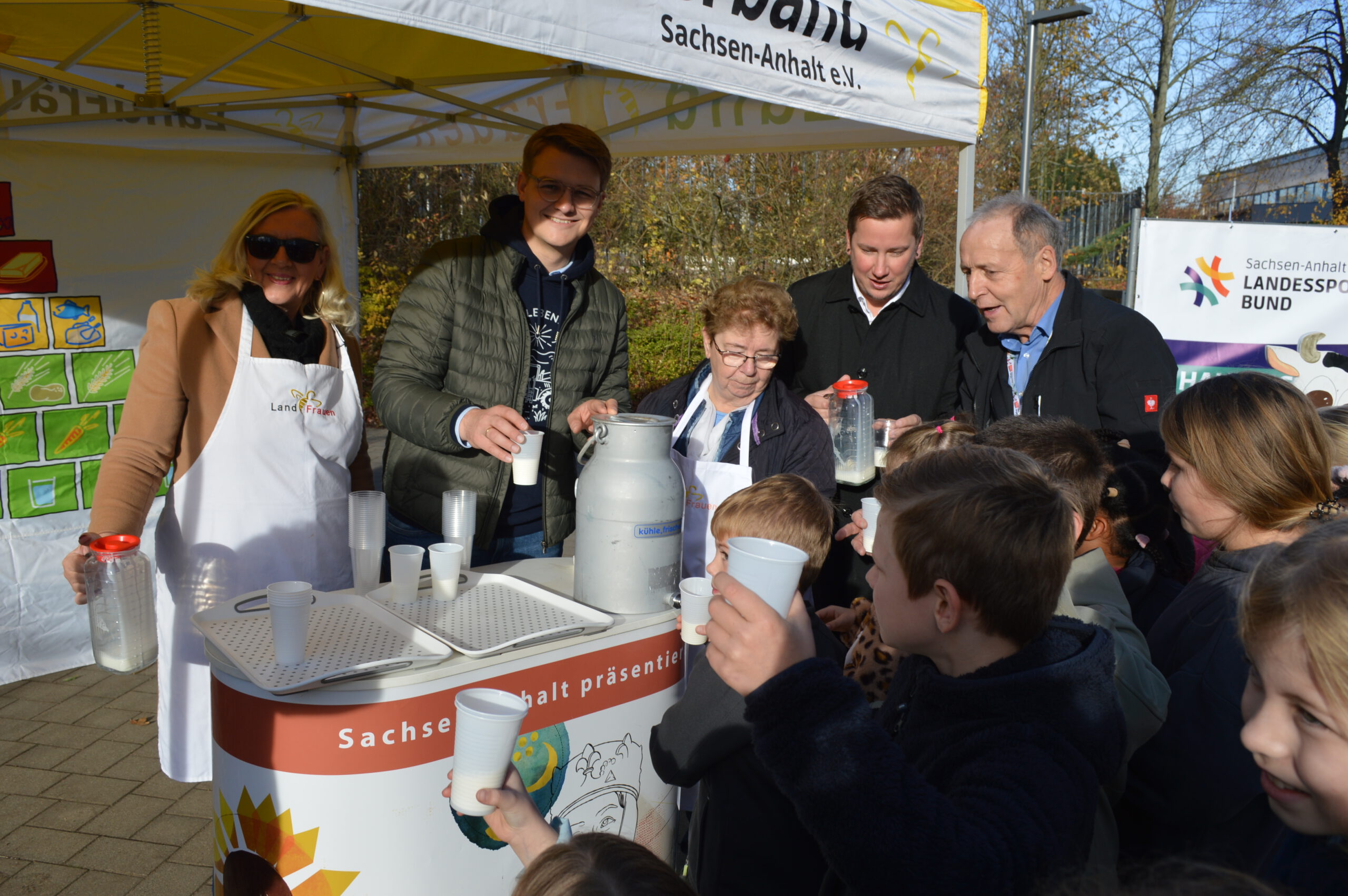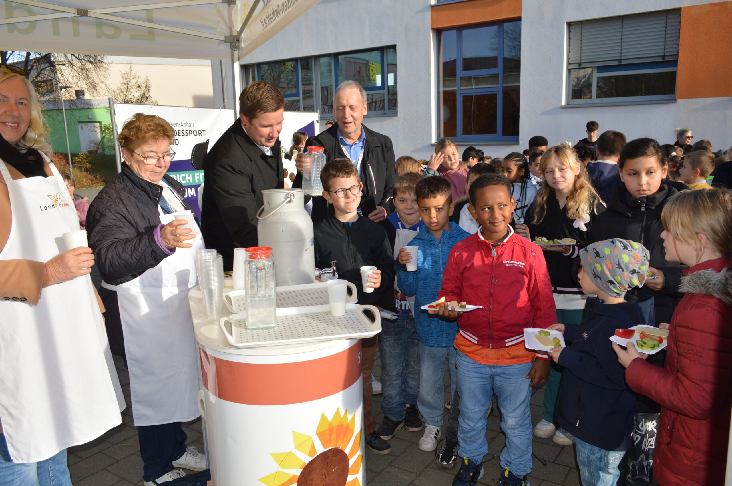 Ein besonderer Gast war der Landtagsabgeordnete Tim Tessmann, der als ehemaliger Schüler der Kästner-Grundschule unbedingt beim Milchausschank dabei sein wollte. Zig Becher der gesunden Flüssigkeit füllte er mit den beiden Landfrauen und Börde-Bauernverbands-Geschäftsführer Marius Thordsen Denecke ab und gab sie den durstigen Mädchen und Jungen in die Hand. Während dessen mussten drei Lehrer gegen drei Schüler im Seilhüpfen antreten. Es ging um einen hausaufgabenfreien Nachmittag. Wolfgang Zahn von der Agrarmarketinggesellschaft rechnete das Ergebnis schön, so dass auch wirklich die Schüler gewannen. Um diese ging es ja schließlich. Sehr interessant fanden die Jungen und besonders die Mädchen das Interview mit der deutschen Meisterin im Damenflorett, Elisa Meier. Mathias Jettschat ließ sich von der jungen Frau im weißen Fechtdress vorführen, wie man mit dem Florett umgeht. Auch viele der Kinder sind in irgendeiner Sportart aktiv. Das fragte der Moderator in der umstehenden Runde ab. Lustig ging es zum Abschluss der Hofpause über den Schulhof in der „größten Polonaise Sachsen-Anhalts“, ehe der normale Schulalltag wieder Einzug hielt.